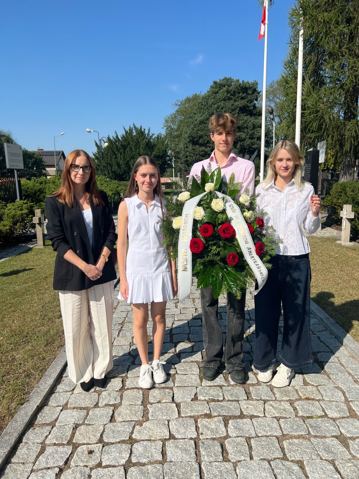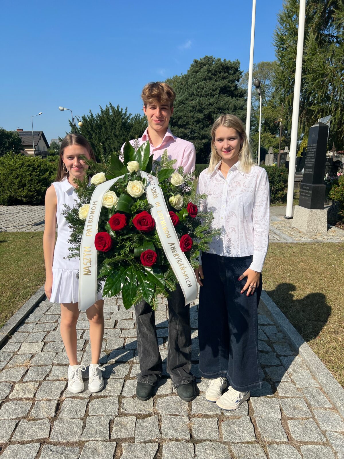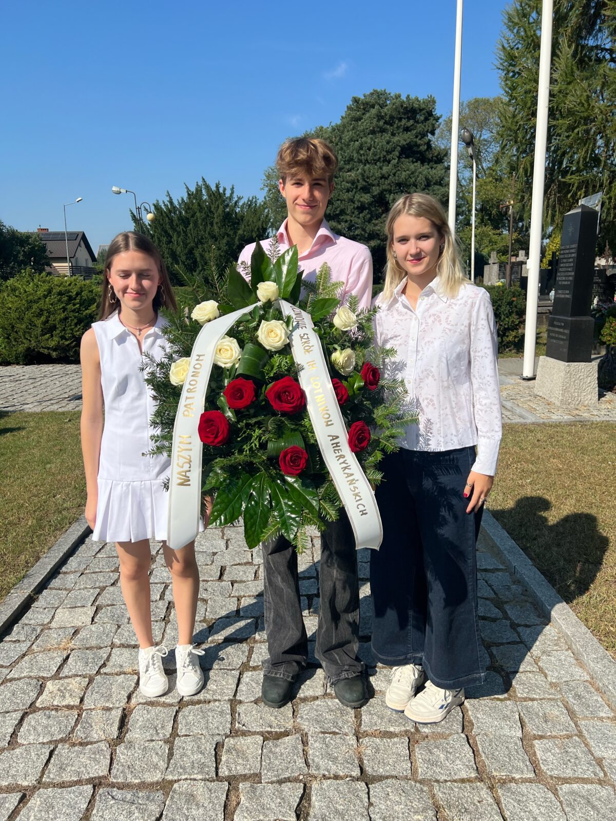 W rocznicę zestrzelenia 18 września 1944 roku nad Dziekanowem Leśnym amerykańskiego samolotu Boeing B-17G, niosącego pomoc walczącej Warszawie, delegacja naszych szkół złożyła w Kiełpinie kwiaty pod pomnikiem naszych Patronów – Lotników Amerykańskich.
