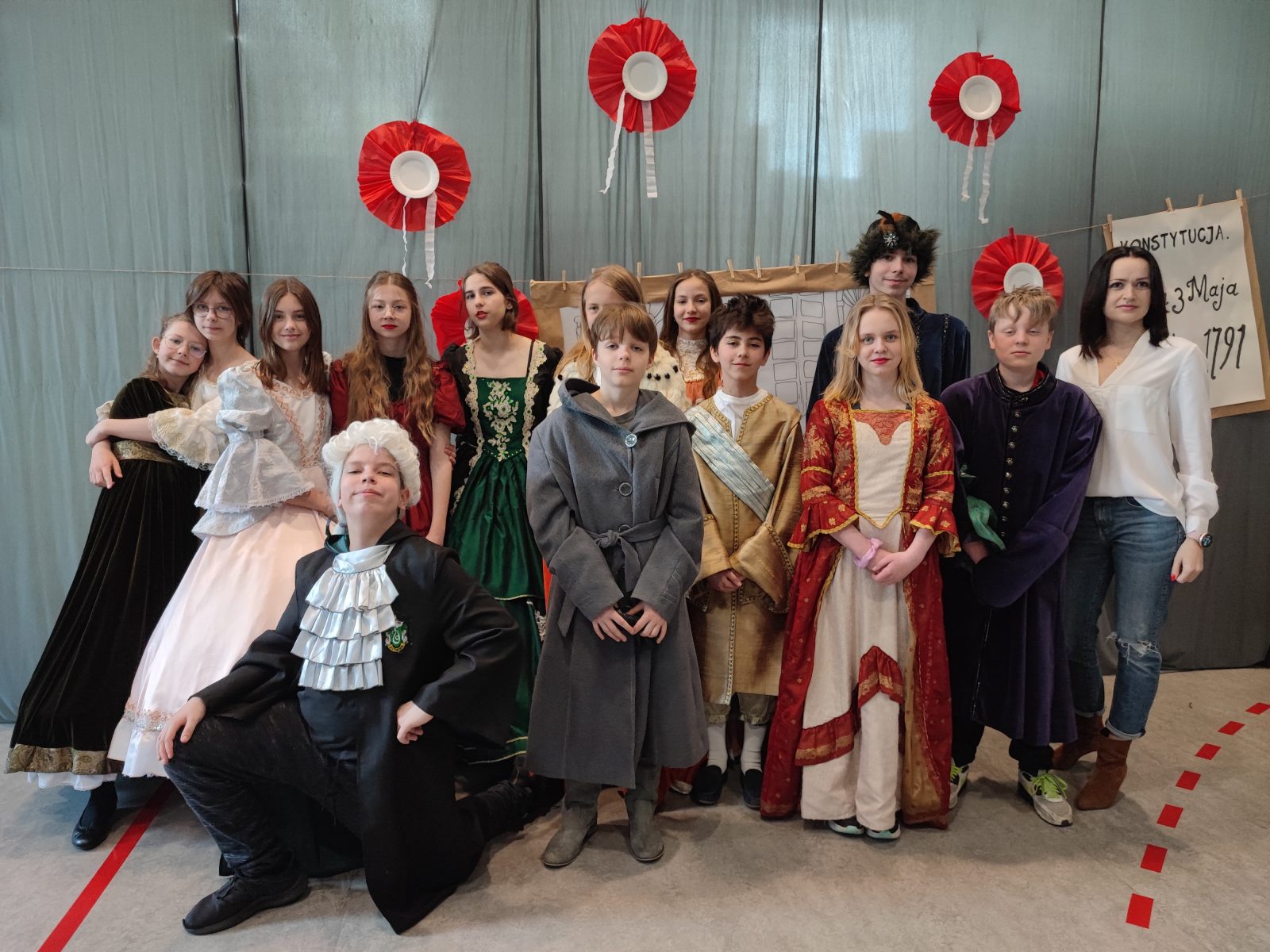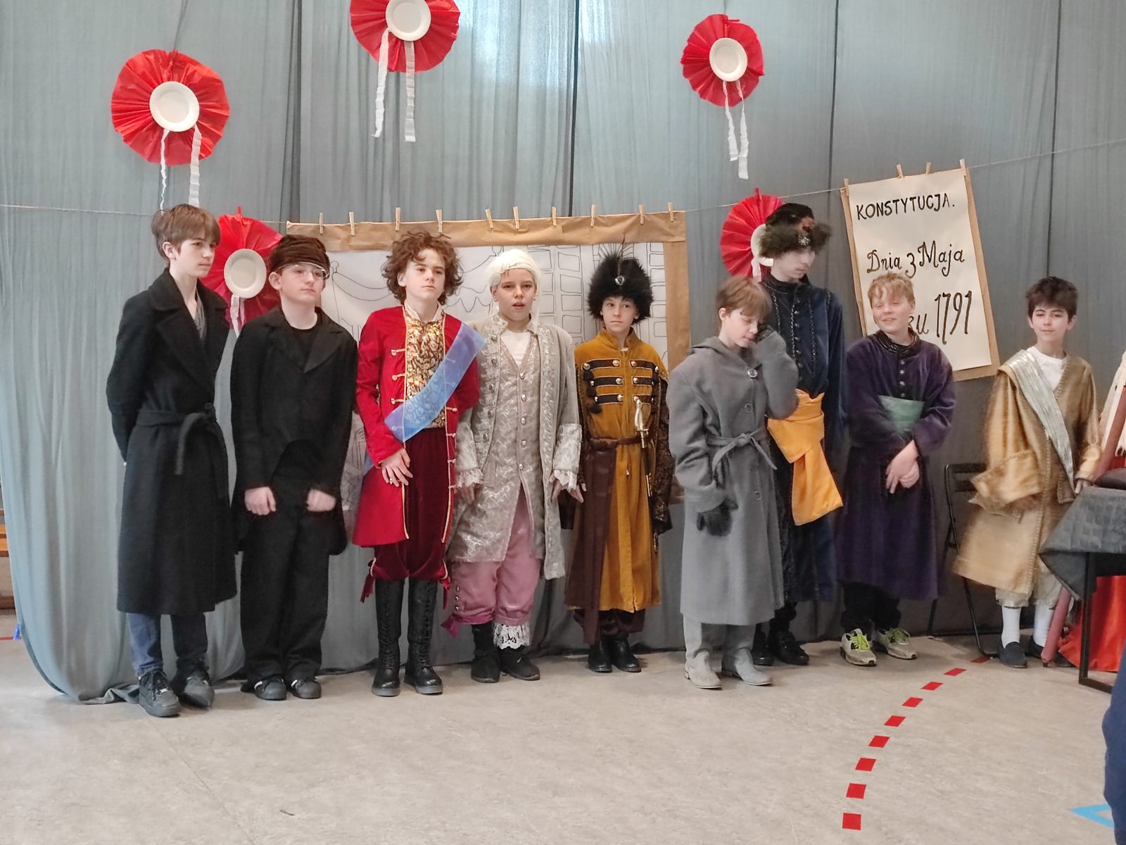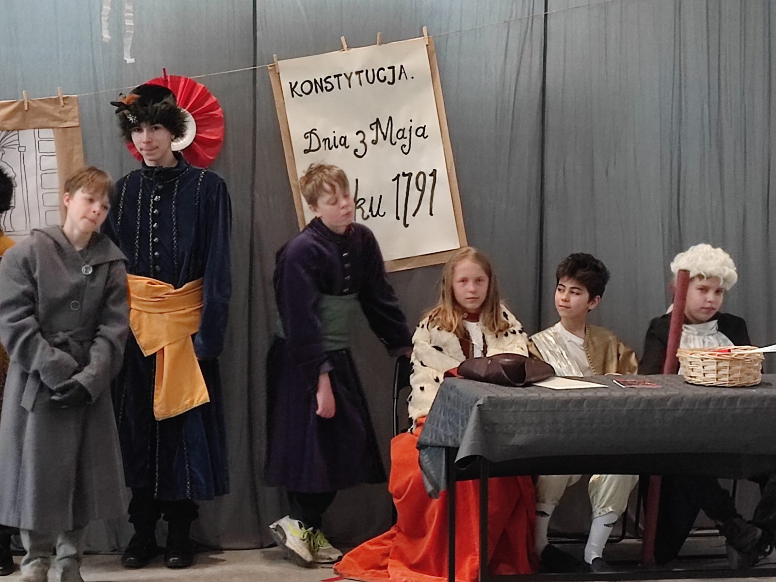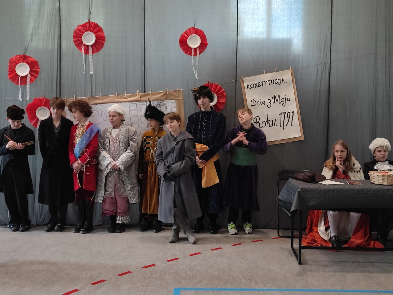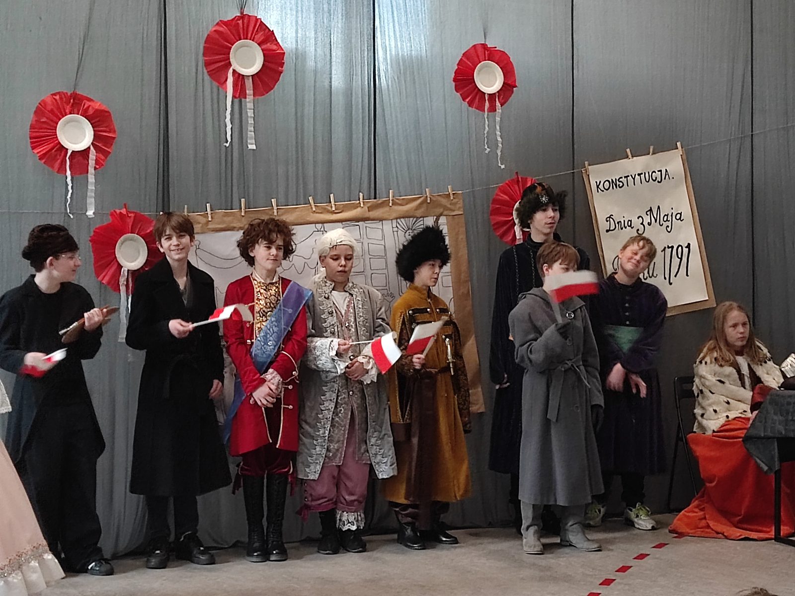 Z okazji 232. rocznicy uchwalenia Konstytucji 3 Maja w naszej szkole odbył się uroczysty apel. Uczniowie klas szóstych ubrani w stroje historyczne przybliżyli Rodzicom, Nauczycielom i Uczniom ciekawe wydarzenia z XVIII wieku. Wspaniale przystrojona sala przeniosła nas do minionej epoki. Szóstoklasiści pięknie zatańczyli poloneza oraz zaśpiewali hymn i pieśń z tamtego okresu pt. Mazurek 3 Maja. Odtworzyli również żywy obraz Jana Matejki.