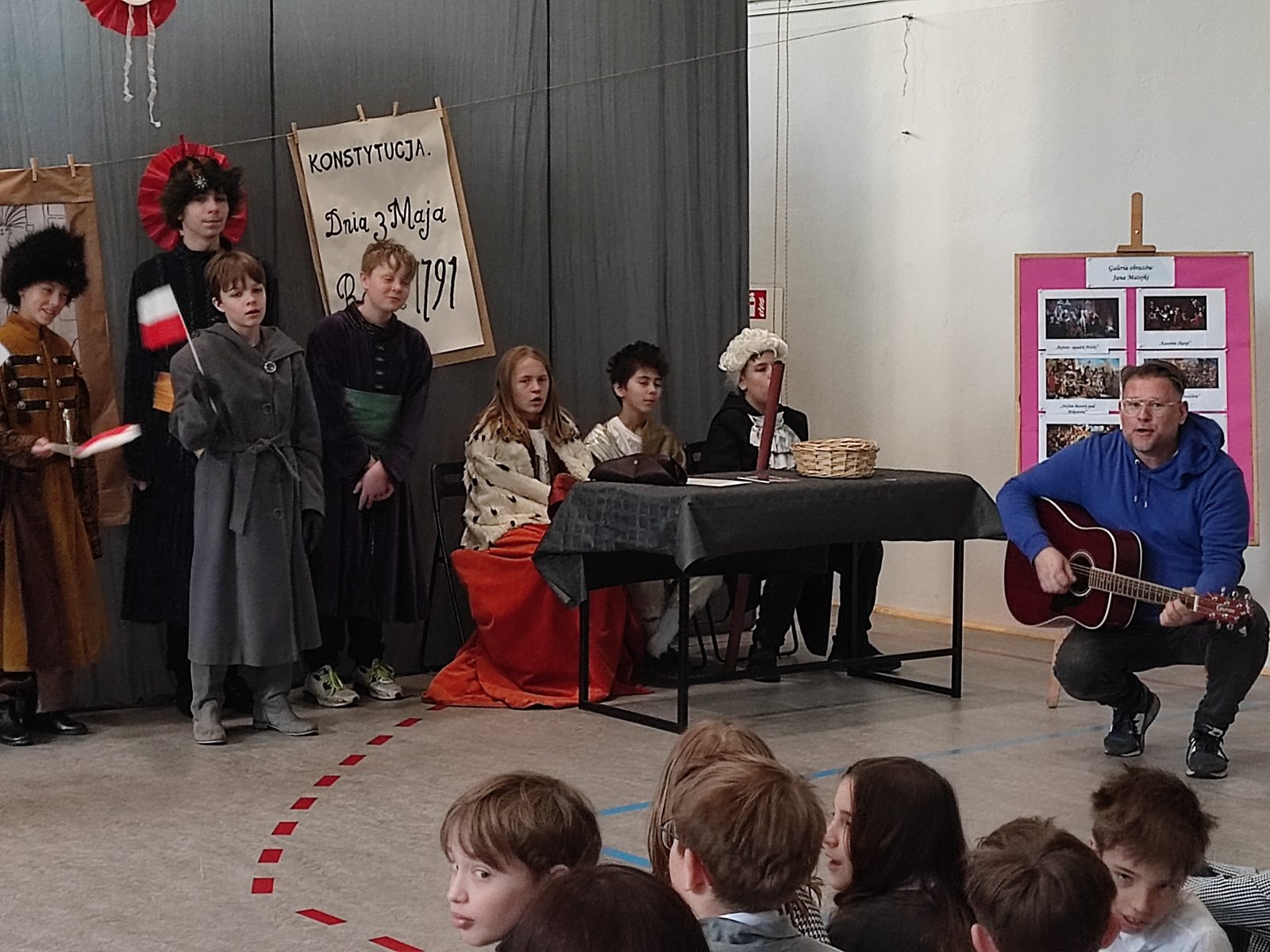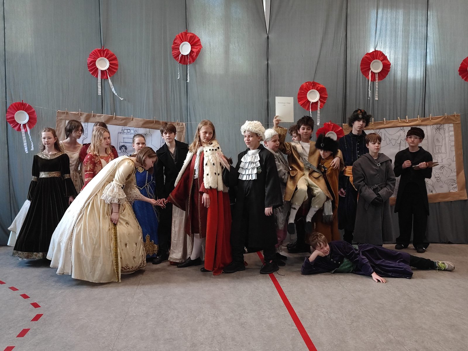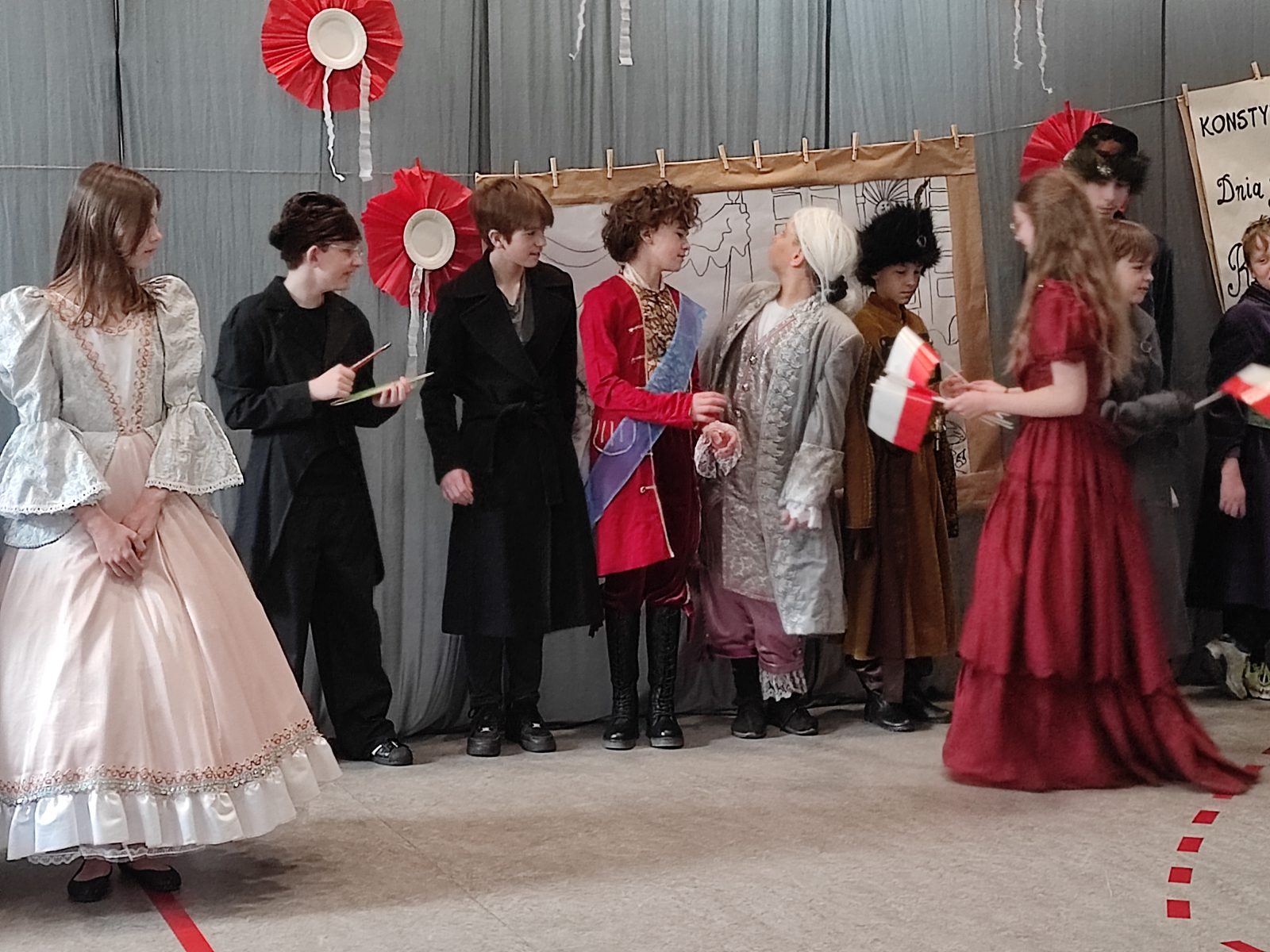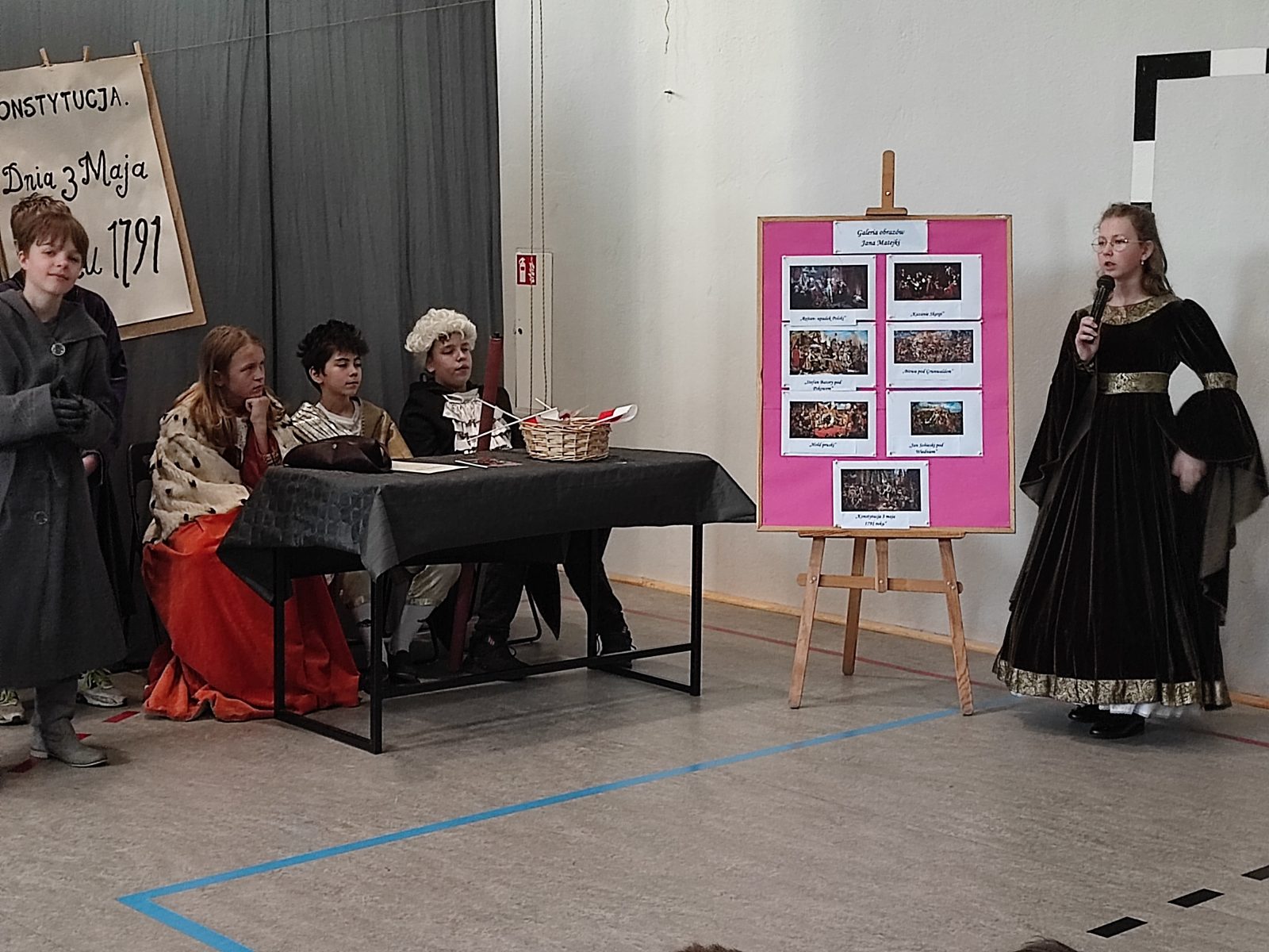 Z okazji 232. rocznicy uchwalenia Konstytucji 3 Maja w naszej szkole odbył się uroczysty apel. Uczniowie klas szóstych ubrani w stroje historyczne przybliżyli Rodzicom, Nauczycielom i Uczniom ciekawe wydarzenia z XVIII wieku. Wspaniale przystrojona sala przeniosła nas do minionej epoki. Szóstoklasiści pięknie zatańczyli poloneza oraz zaśpiewali hymn i pieśń z tamtego okresu pt. Mazurek 3 Maja. Odtworzyli również żywy obraz Jana Matejki.