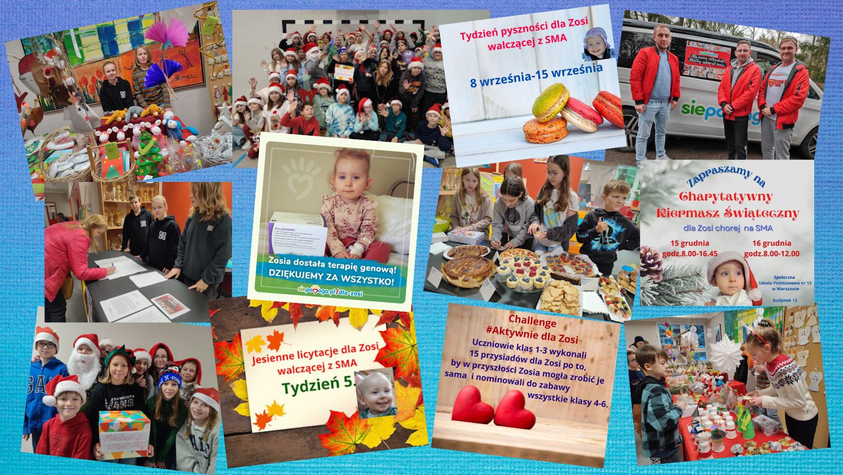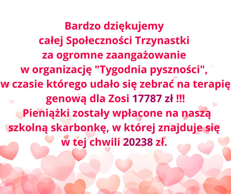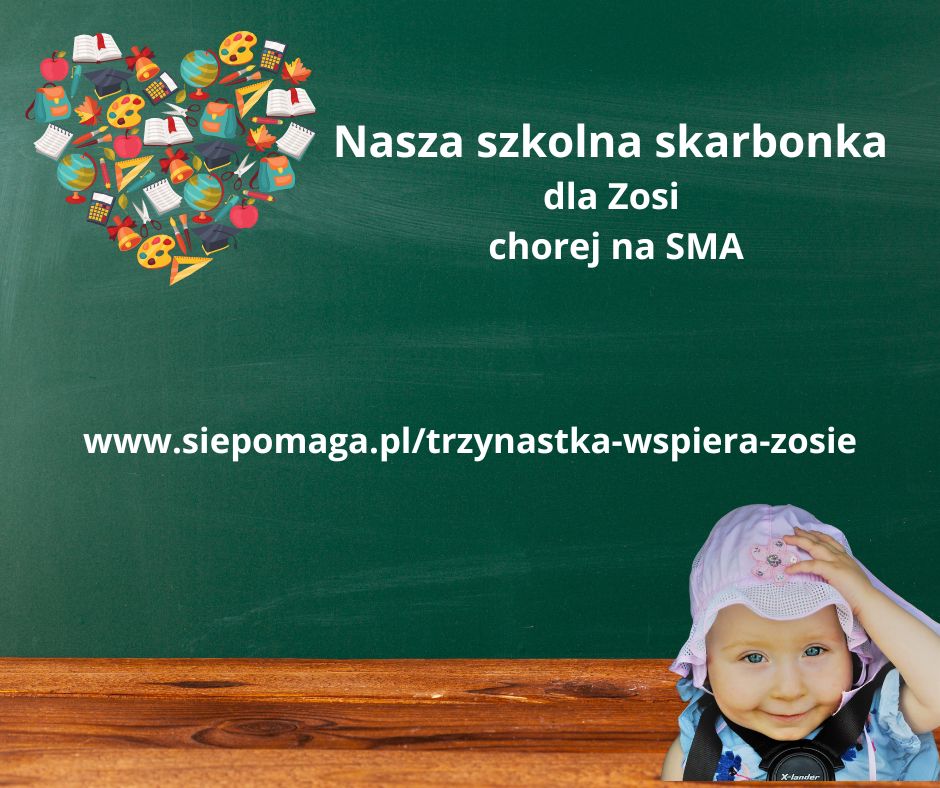 Dziękujemy wszystkim Uczniom, Rodzicom, Nauczycielom, Pracownikom Trzynastki oraz Przyjaciołom naszej szkoły za zaangażowanie w zbiórkę dla Zosi, za wpłaty, za udostępnienia postów, za przepyszne wypieki we wrześniu, za fanty na „Jesienne licytacje”, za złożenie podpisów pod petycją, za przepiękne rzeczy przygotowane na Świąteczny Kiermasz. Bez Waszej pomocy i zaangażowania wszystkie szkolne akcje dla Zosi nie byłyby możliwe.