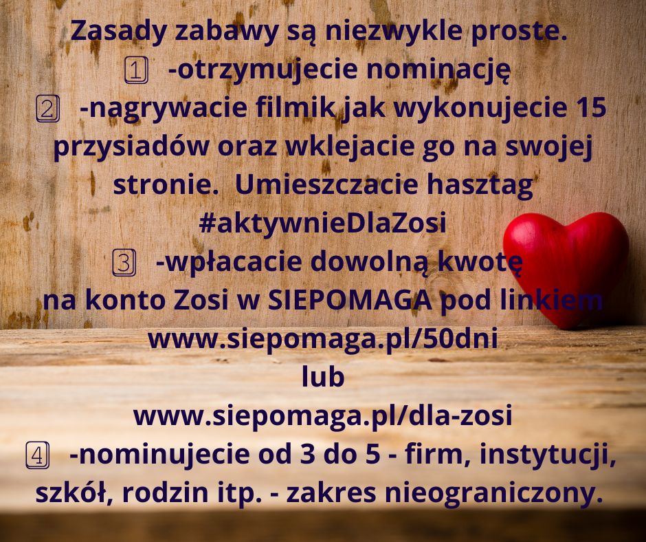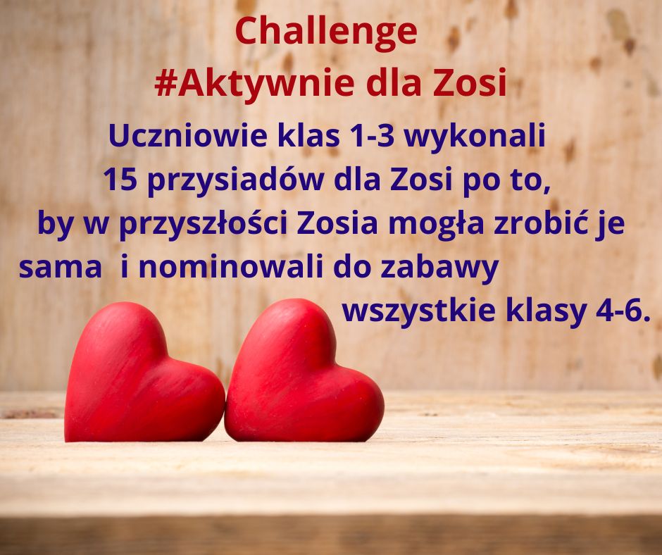 Kilka dni po tej słodkiej akcji niespodziewanie zadzwonił do szkoły tata Zosi z pytaniem, czy może nas odwiedzić. Oczywiście, zapraszamy!!! I w ten sposób poznaliśmy Tomka Szcześniewskiego – tatę Zosi. Dwa dni później w czasie spotkania w sali gimnastycznej tata Zosi podziękował całej Społeczności Trzynastki za pomoc, opowiedział o Zosi i o walce o jej zdrowie. A my przystąpiliśmy do challengu „Aktywnie dla Zosi” i wykonaliśmy 20 przysiadów po to , żeby w przyszłości Zosia mogła zrobić je sama. I nominowaliśmy do challengu kolejne osoby.