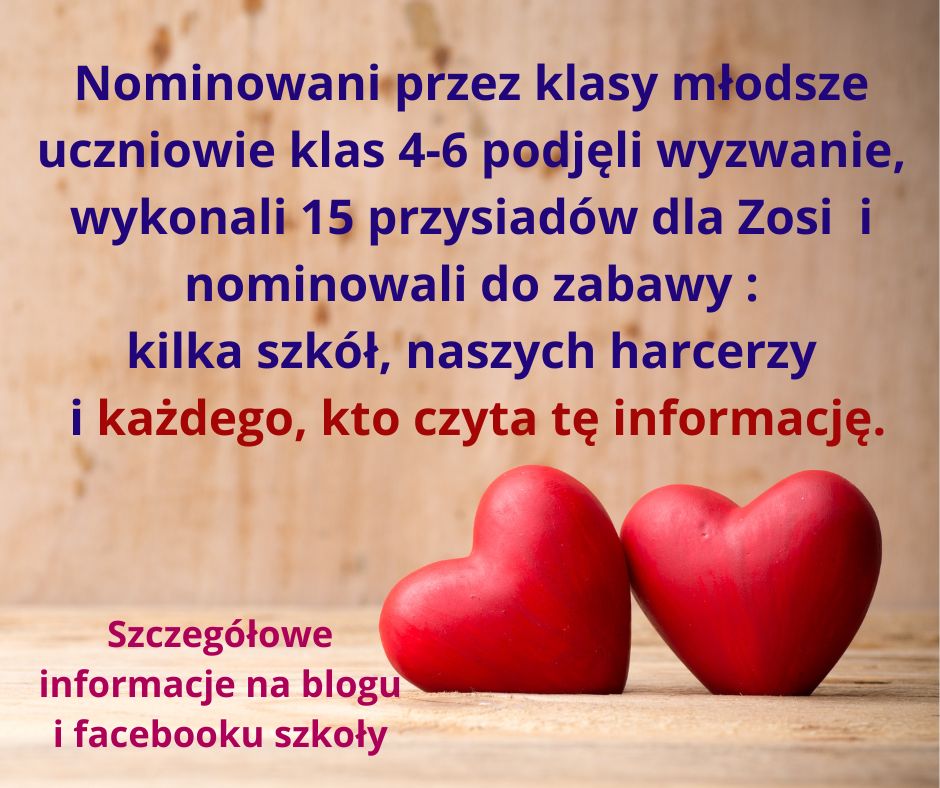 W grudniu zostaliśmy nominowani na facebooku przez ekipę „Pieszo po zdrowie” do challengu „Mikołaje Zosi”. Zrobiliśmy zdjęcia w mikołajowych czapkach (można je pobrać na pamiątkę na szkolnym facebooku i blogu) i wrzuciliśmy symboliczne złotówki do Zośkowej puszki, zasilając zbiórkę kwotą 240zł.