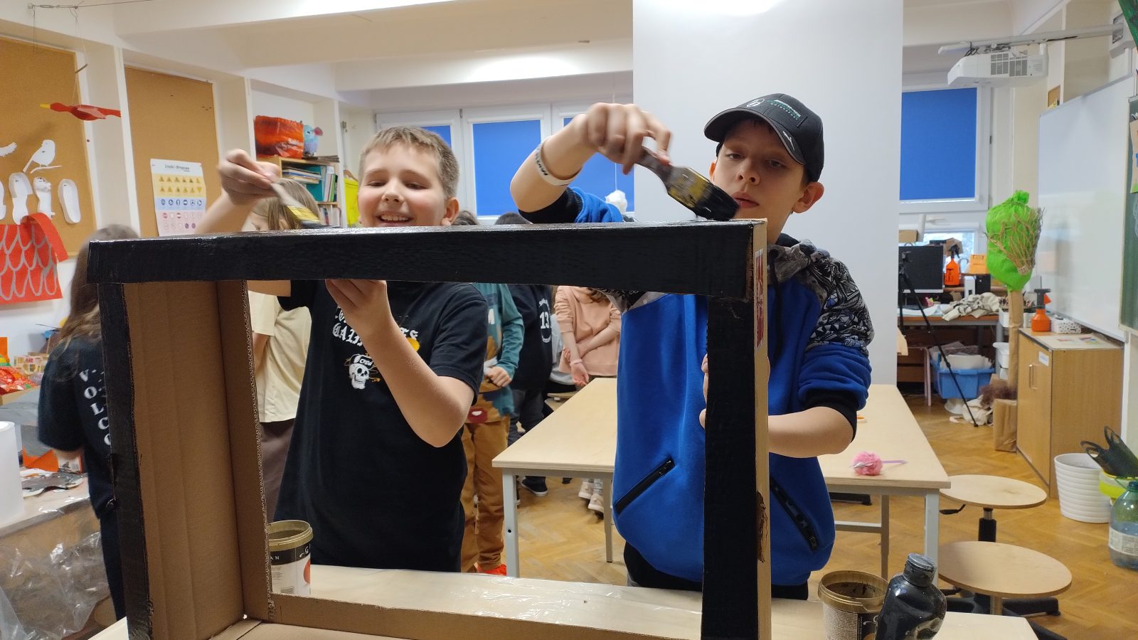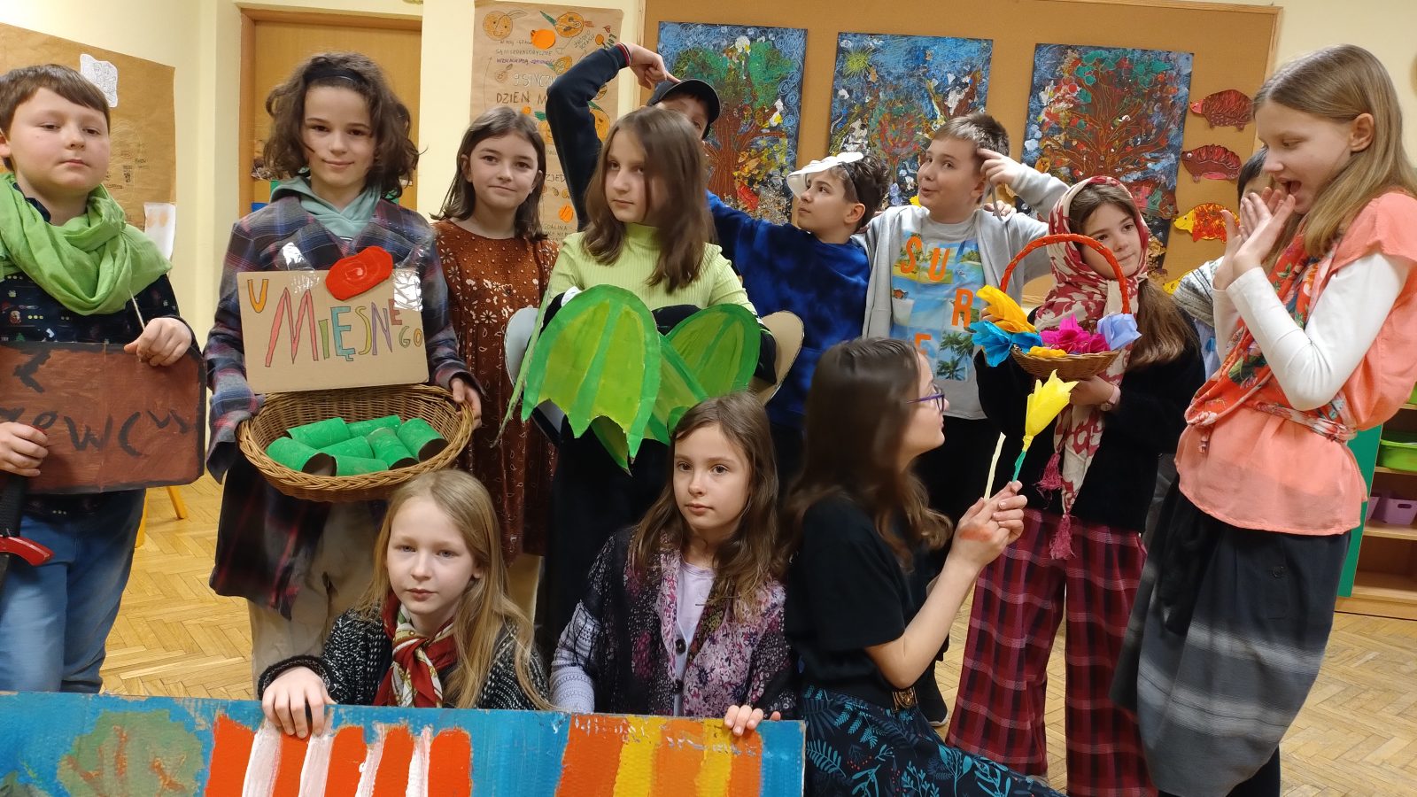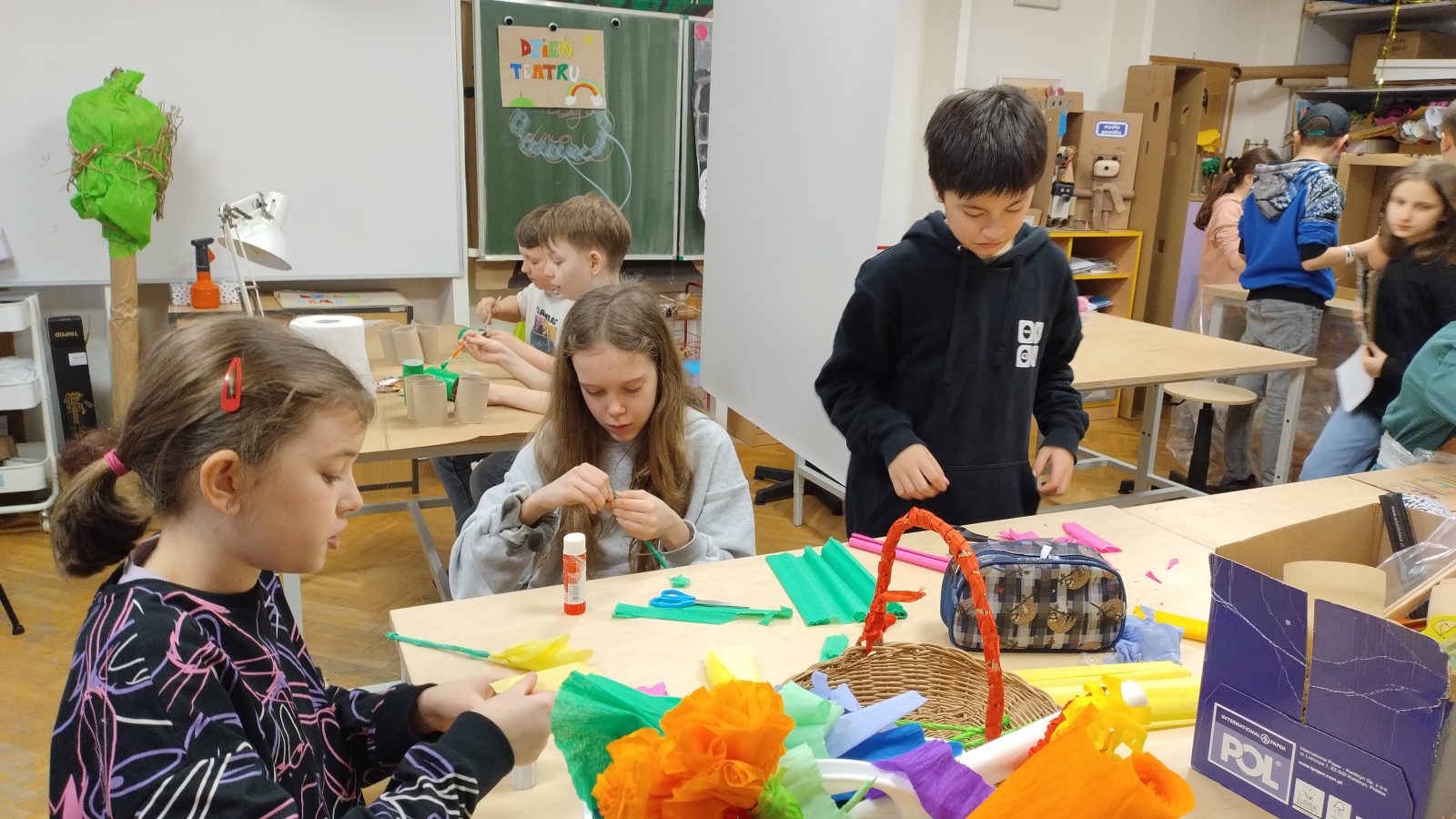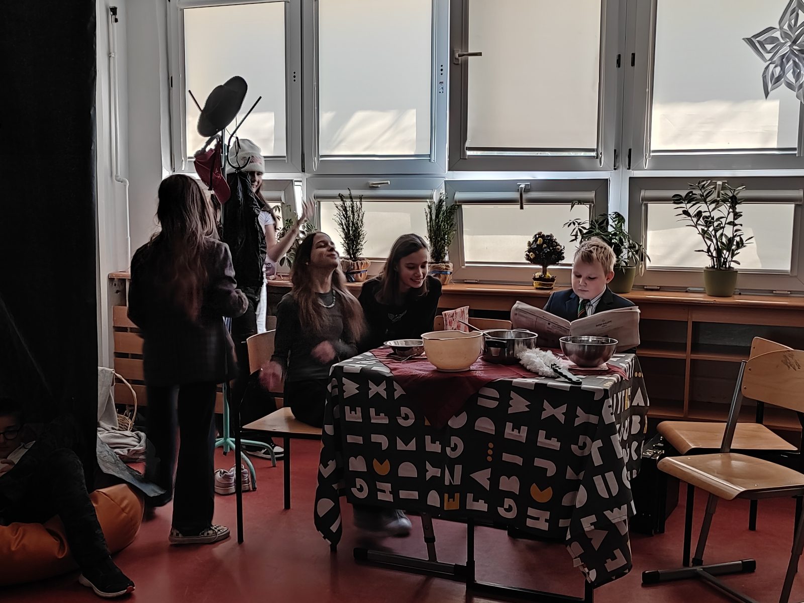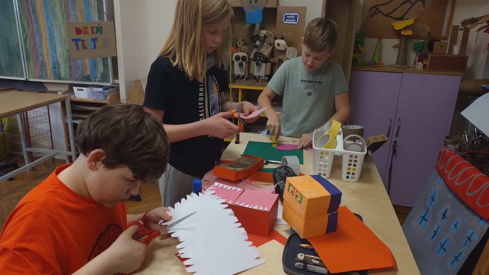 Na plastyce i technice uczniowie pracowali nad scenografią, projektowali kostiumy i wykonywali rekwizyty.