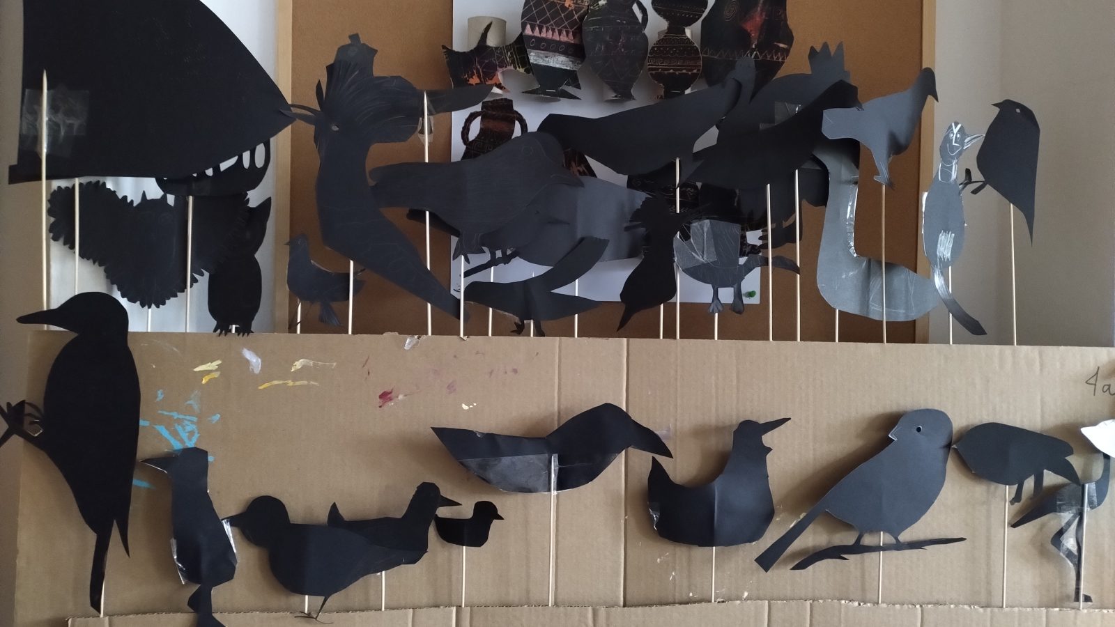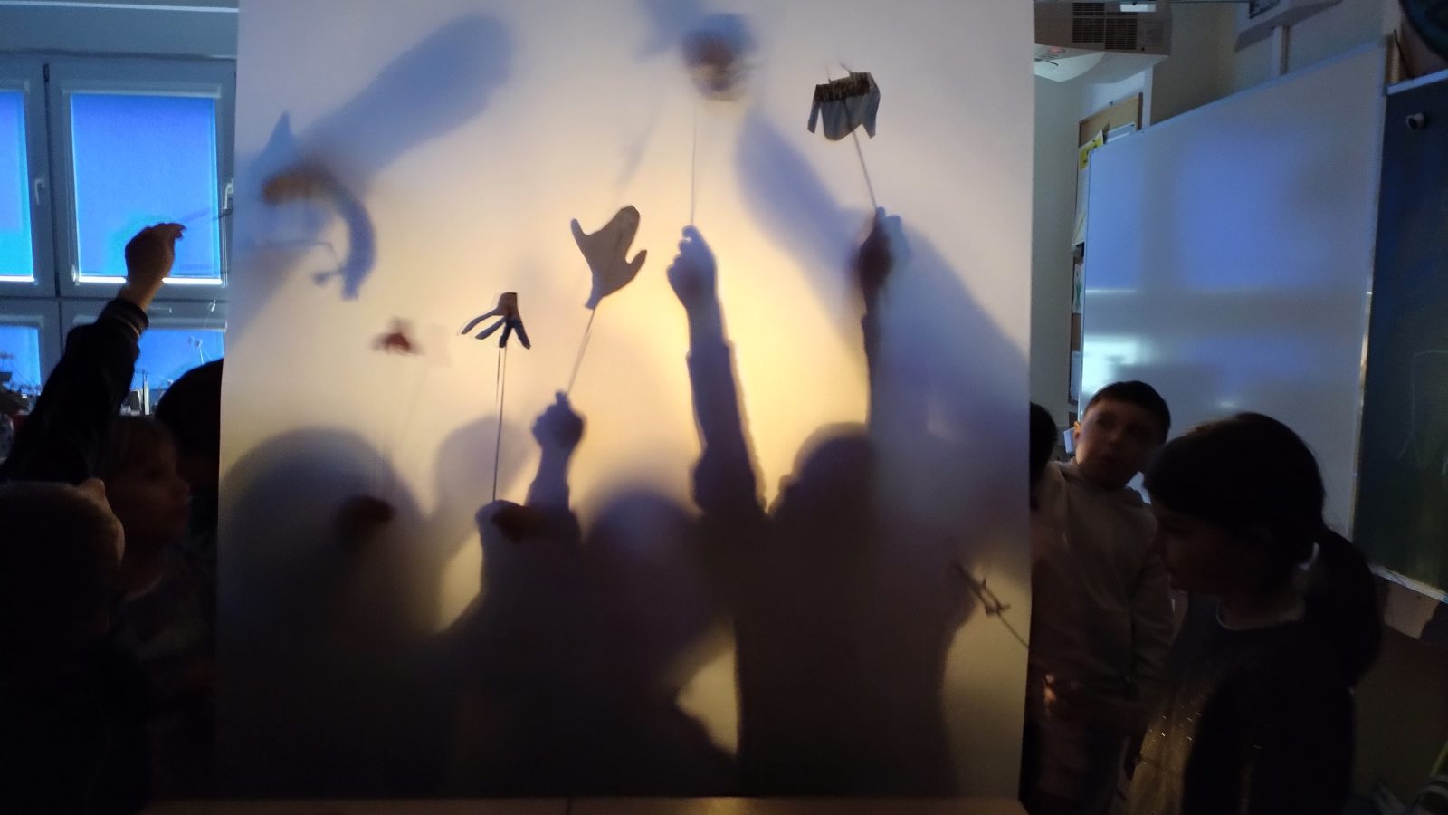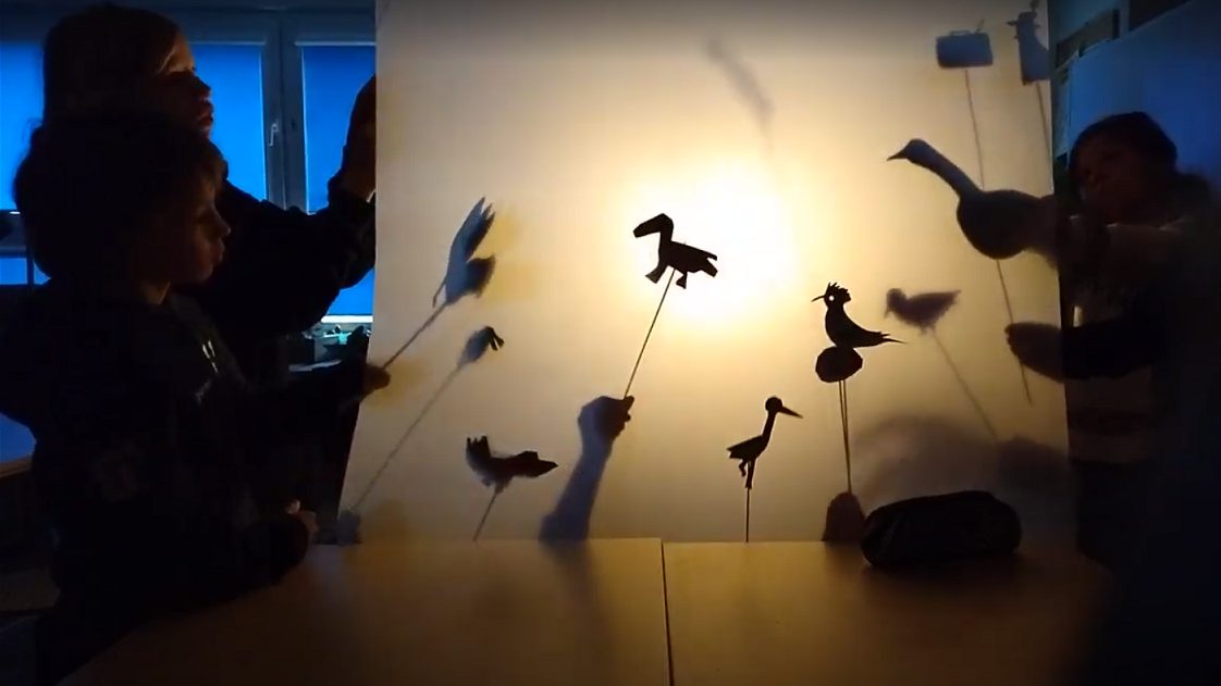 W sali artystycznej powstał teatr cieni – klasy czwarte opracowywały wiersz „Ptasie Radio” Juliana Tuwima.