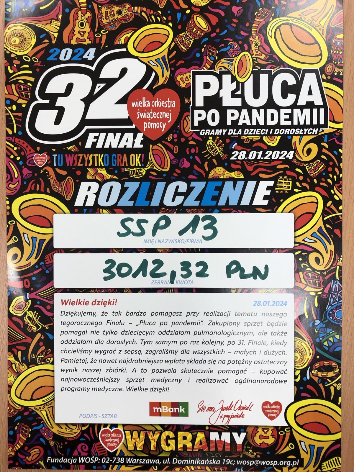 W czasie 32 Finału WOŚP Trzynastka zebrała 8882,32zł, z czego: